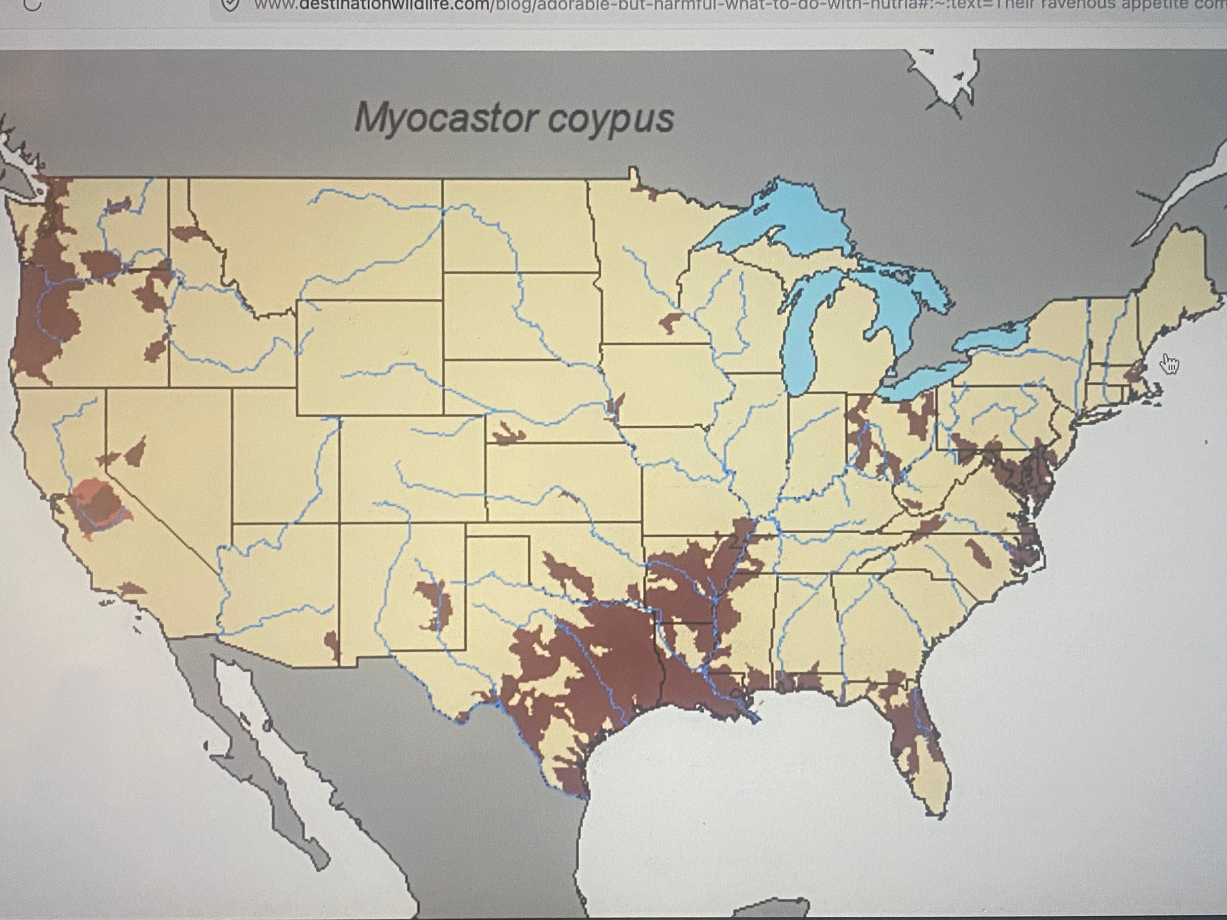 Nutria were imported to North America in the 1890's, mostly to California, Ohio and Louisiana and were farmed for their pelts to make fur coats. When the fur industry collapsed in the 1940's and farmers could no longer afford to feed them, some nutria were released into the wild and became feral populations, now residing in some 18 U.S. states. Here's the current distribution:\(//////\)